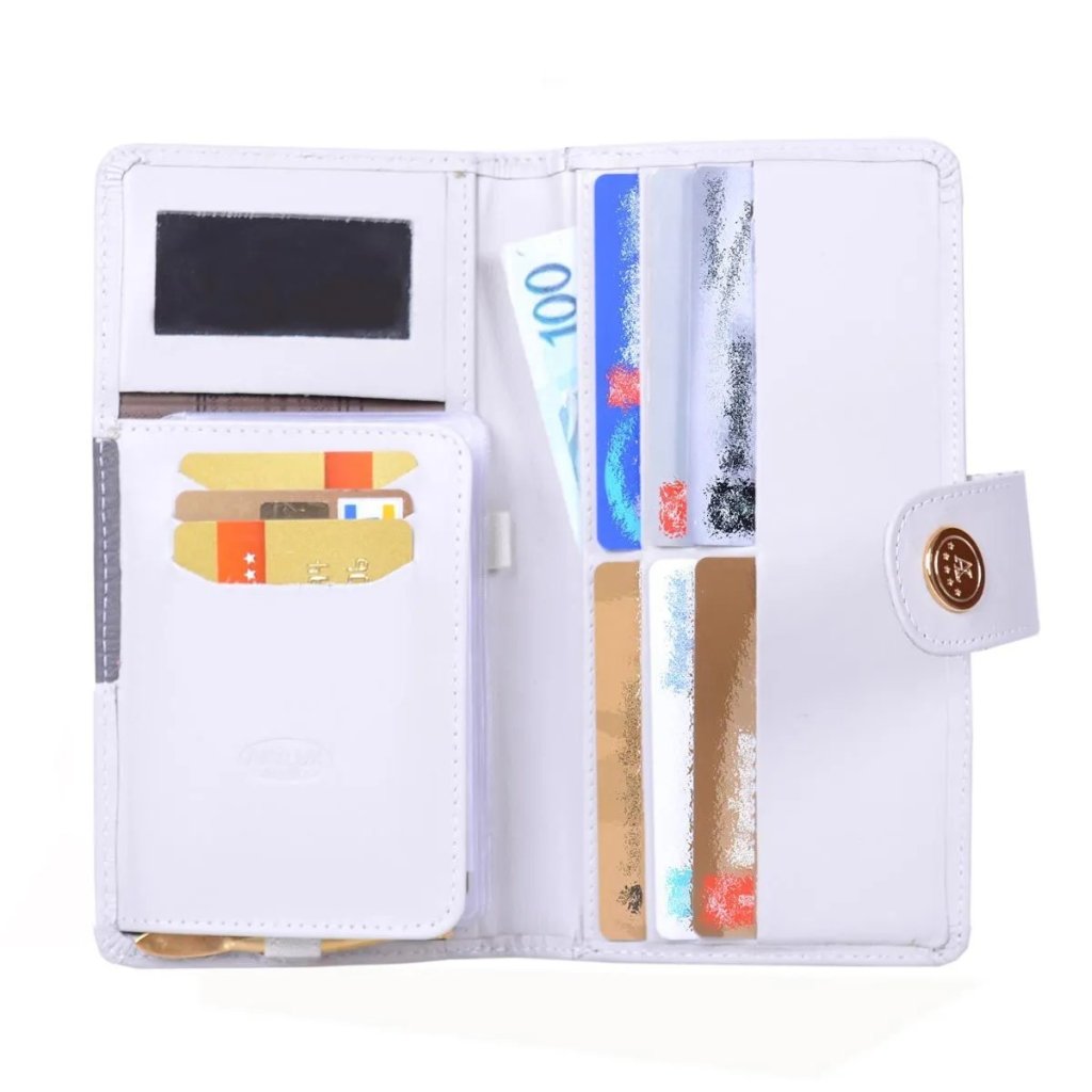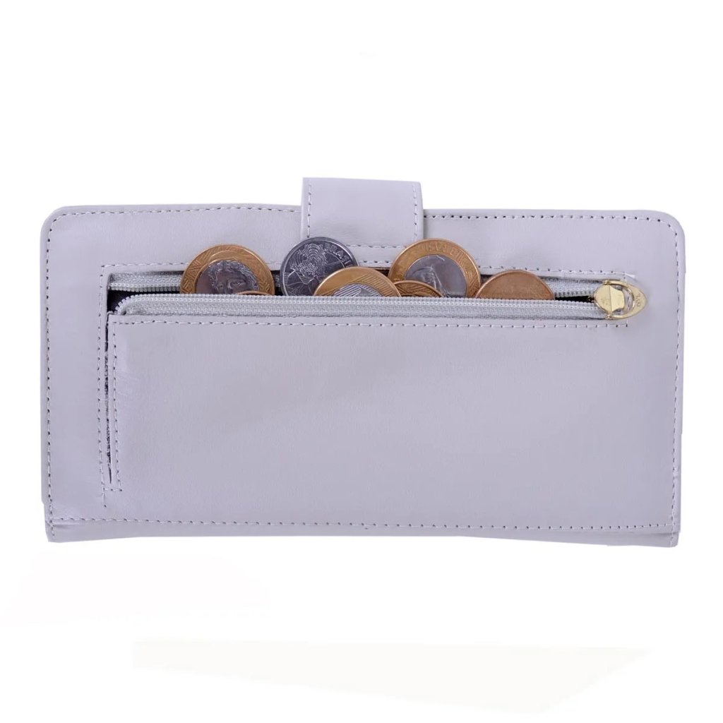 Carteira Feminina confeccionada em Couro de alta qualidade. Contém compartimentos para até 10 Cartões de Crédito, Porta Notas, Porta Documentos em PVC, 1 Espelho e Porta Moedas externo com fechamento em zíper. Fechamento total com ponteira e botão de pressão.
